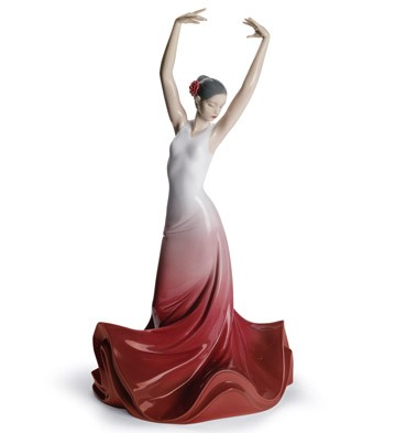 An extraordinary composition of a love scene in classic porcelain. A beautiful couple appears in formal evening gala dress and white tuxedo, in a classic but updated style. Bunches of blue and rosa hortensias at their feet, plus varied flowers on the upper pots. The floor is paved with a pebble mosaic pattern. The classic appearance is broken by his untied bow in a very casual and familiar way, while her attitude is very dear and loving. This piece can be an unforgettable gift for a wedding or engagement.